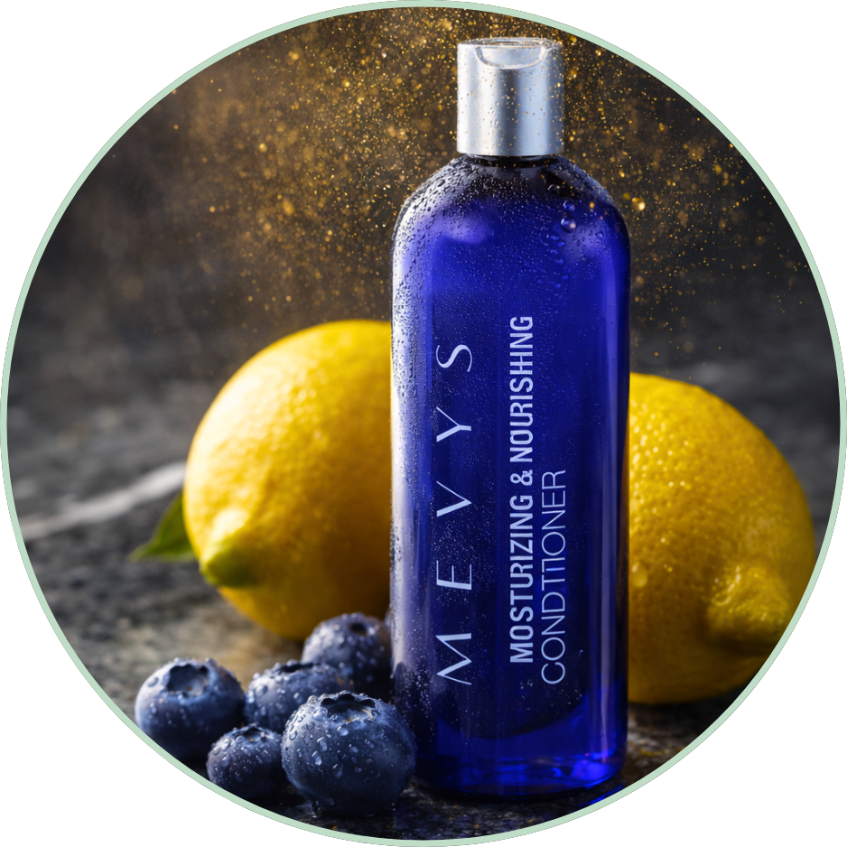 Hair naturally has a slightly acidic surface pH (approximately 4.5–5.5). During cleansing — and especially during chemical services like coloring or bleaching — the cuticle layers of the hair lift, and the internal structure becomes more vulnerable. An acidic conditioner (pH 4–5) is essential because it helps re-compact the cuticle layers after washing, restoring surface alignment and reducing porosity. When the cuticle is more compact, light reflects more evenly (improving shine) and artificial pigments remain better sealed within the fiber. This is particularly important for color-treated hair, as an alkaline or improperly balanced product can prolong cuticle swelling, increasing pigment loss and fading. By maintaining an acidic pH, the Mevys Conditioner supports cuticle stability, enhances color longevity, and helps return the hair to a balanced, controlled state after cleansing or chemical exposure.
