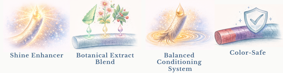 • Shine Enhancer: Improves cuticle alignment to enhance natural light reflection, delivering healthy-looking shine through surface optimization rather than heavy coating.